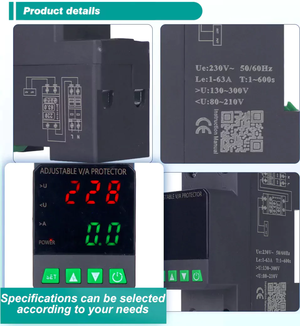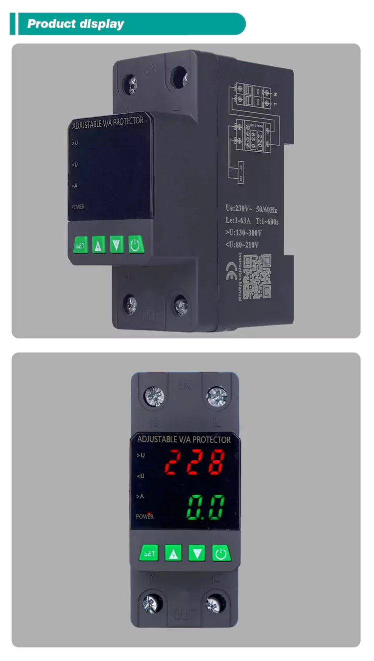 డిజిటల్ డిస్ప్లేతో అమర్చబడి, దిగుమతి చేసుకున్న మాడ్యులర్ ఎలక్ట్రానిక్ భాగాలతో తయారు చేయబడింది, ఇది అధిక విశ్వసనీయత మరియు పనితీరును కలిగి ఉంటుంది. ప్రొటెక్టర్ అసాధారణమైన వోల్టేజీల సమయంలో (ఓవర్ వోల్టేజ్, అండర్ వోల్టేజ్ లేదా గ్రిడ్ హెచ్చుతగ్గులు వంటివి) స్వయంచాలకంగా మరియు త్వరగా విద్యుత్ సరఫరాను తగ్గిస్తుంది మరియు వోల్టేజ్ సాధారణ స్థితికి తిరిగి వచ్చిన తరువాత విద్యుత్ సరఫరాను పునరుద్ధరిస్తుంది.